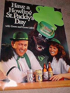 Well in 1986, the Beer Wolf must have grown out his pubes and started working out because he exploded on the scene and was immediately the Hunkiest wolf in every city and in every town. The Coors “Silver Bullet” mascot was now a household name and noticeable differences included lighter colored fur, yellow eyes, big lips and even sometimes neon sunglasses. This new and improved Beer Wolf always ended each picture with a big smile to show that he’s always cool and ready to party. Just look at him howling in on these partygoers during a St. Patrick’s Day celebration.