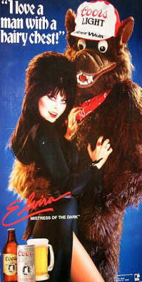 With this change, this new wolf proved to be sexier by fans. Coors went on to be hugely successful during Halloween, when “Elvira, Mistress of the Dark” joined Beer Wolf campaign and posed for a complete photoshoot with the hairy ol’ stud. Promo items were introduced such as plushies, pins, dishware, T-shirts, bar ads, posters, stickers, costumes and even underwear. Also, one of the best moments for Beer Wolf was when Coors released werewolf statues in bars and supermarkets, which had a cassette tape player that people could walk by an hear the happy voice of Beer Wolf.