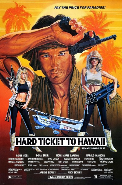 Anyone who tuned into cable TV in the ‘80s or ‘90s after 11p.m. at night, or browsed through a dusty mom ‘n pop video store in the VHS era most certainly will have set their eyes at one time or another on the films of Andy Sidaris, the undisputed king of the “Triple Bs”: Bullets, Bombs and Babes. Featuring exotic locations, absurd plots, debatable acting and bikini-clad bimbos toting massive firepower, these flicks are a total blast to behold — and none are more gleefully ridiculous and fist-pumping than Hard Ticket To Hawaii, Sidaris’ masterpiece of wacky-ass destruction and toplessness. Wearing “barely-there outfits with the molecular weight of cobalt” (DVD Verdict), crimefighting duo Donna and Taryn are out to stop a gem smuggler, a huge killer snake pumped up with toxic chemicals, and other assorted bloodthirsty, sweaty sleazeballs. Also featuring a legendary, gory razor frisbee trick, lush Hawaiian travelogue footage and possibly the greatest use of a rocket launcher ever filmed, Hard Ticket is pure late-night heaven. Hard Ticket To Hawaii producer Arlene Sidaris will be here in person to introduce the film!