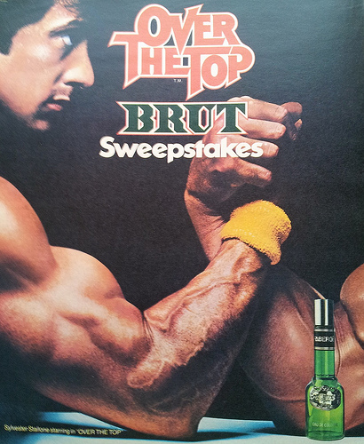 If you know your Over the Top, then you know how vital product placement was in the making of this motion picture. Absurd amounts of product placement. Leave it to the united powerhouse of Stallone and Cannon Films to partner up with everyone from Alker Seltzer and Carl’s Jr…..to Soloflex and Pizza Hut. But our favorite by far is their alliance with the popular men’s grooming product Brut. Known mostly for their cologne and deodorant, Brut claims that they “position themselves to live up to their tag-line…The Essence of Man.” What better product choice could there be? Lincoln Hawk of course hauls around a Brut semi-truck in the film…but beyond that, during the release of the movie there was a Brut SWEEPSTAKES. Play the video below to find out what lucky winners received if they hit the mighty jackpot..
