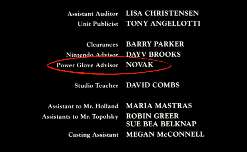 Before getting into the first breaking news of 2013, I’d like to examine the following to see if i’m not the only one who’s noticed it. As i’m watching the credits roll on a private screening of the 1989 Fred Savage video game extravaganza flick The Wizard, I catch something on the screen that immediately melts my face. As seen in the above image, just below the credit listings for “Clearances” and “Nintendo Advisor” reads “Power Glove Advisor – NOVAK.” Pause…….let that resonate for a moment……..ok, EXPLODE.