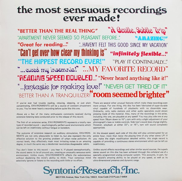 Repeatedly stated on the backside of each LP is an insane amount of hype, insisting that what you’re about to hear will be life changing. The liner notes inside give detailed instructions on “how to use” these records. Detailed isn’t even the right word, the directions given are so specific and informative that they include sections on “optimum results”, “continuous playback” “quadraphonic playback” and even “how to wash” the records.