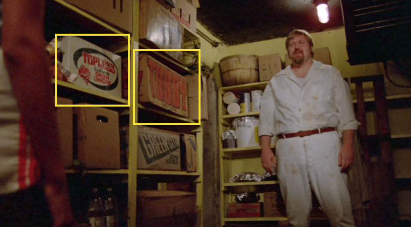 Pause! Notice how one of the boxes in the storage room has a label that discretely says TOPLESS and another that says TUBBY.