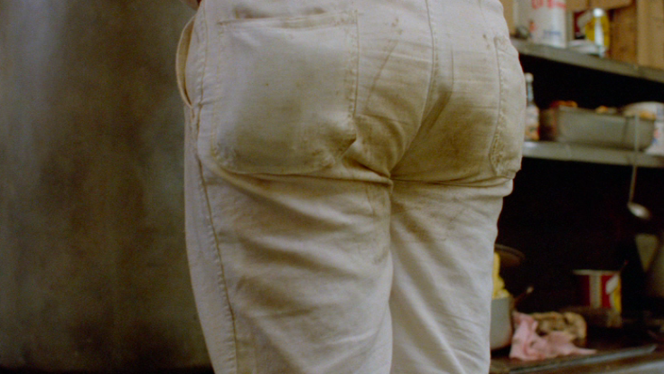 Several minutes later we see Artie cooking corn and standing on a stool over a massive pot of boiling water. Then, the camera pans to a revolting but important extreme-close-up of the dirty stained butt of his pants..