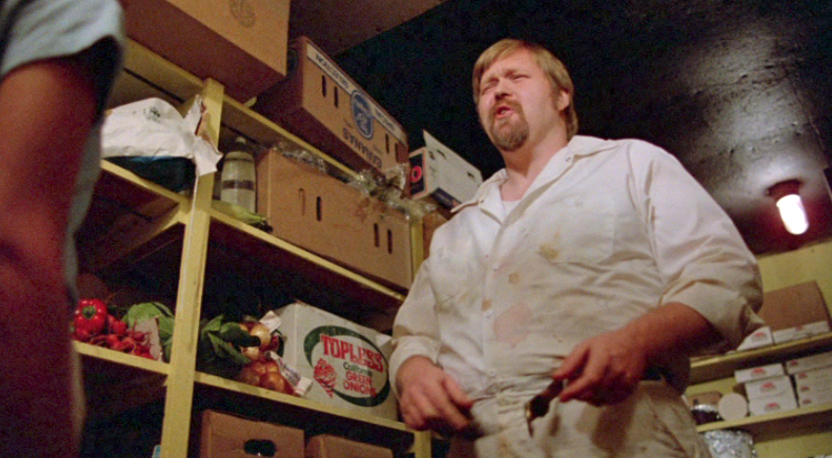 Suddenly a hand appears and begins to pull the step-stool out from below him. Without giving the entire scene away in the event that you still haven’t seen Sleepaway Camp (!?), here’s how our trusty head cook appears during his final moments..