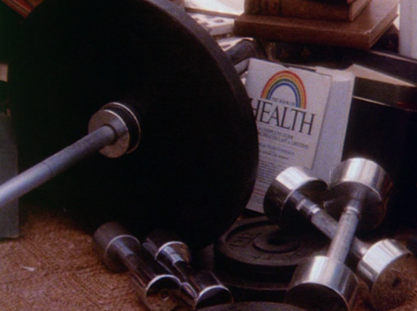 Aside from a few other various views of the island and a 1-second scene of Julius doing some karate with a wise old sensei, that’s all the information we get. Oh, and this extreme-close-up of a room in the Professor’s home featuring some finely polished weight equipment, a book on HEALTH and several stacks of literature: