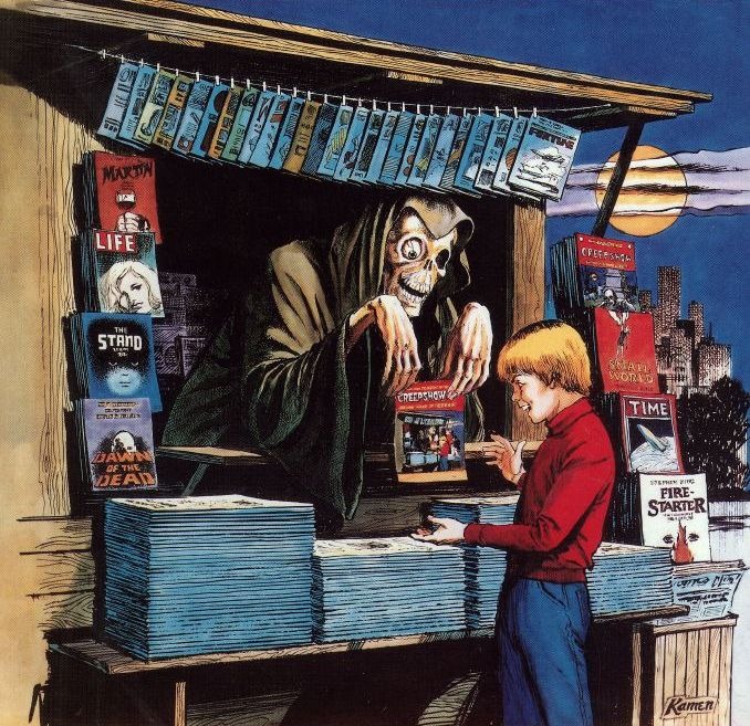 This little number also reminds me of riding bikes under the moonlight through Old Man Covington’s woods on chilly October evenings. We’d race through the damp paths, our tires slipping on the wet leaves as each of us raced to be the first one to reach our monster club’s tree house hangout. If you stayed left at the fork in the path you’d eventually pass the town slaughterhouse where butchers could be heard inside working the graveyard shift. One night I dropped my Baby Ruth bar by accident and out of the corner of my eye saw the figure of what appeared to be a 7 foot tall wolf with a huge smile on his face entering the front entrance to the slaughterhouse. Then I caught a strong downwind smell of freshly poured beer. Then came the human screams of agony, followed by a brief silence and finally the distinct (and unexpected) noise of beer cans opening. As I stood paralyzed with fear, I saw two blood-red eyes from a distance looking directly at me. Then that huge, grizzly smile appeared again which was followed by constant burping noises. I found this to be extremely strange and quickly got back on my bike to pedal away. I shared my story that night at our monster club’s midnight society tree house meeting. “The Tale of the Thirsty Wolf”…