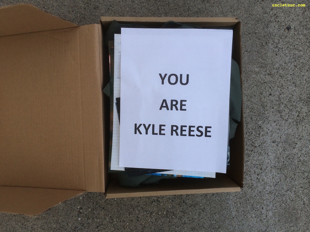 Not knowing who sent this has my mind going in swirls. Could it be from a survivor of a future nuclear war? A lone warrior sending a signal to Uncle T, warning about defense network computers and H-K’s (hunter killers) that threaten to wipe out the entire human race? That bold statement “YOU ARE KYLE REESE” keeps repeating in my head – beckoning me to do something.