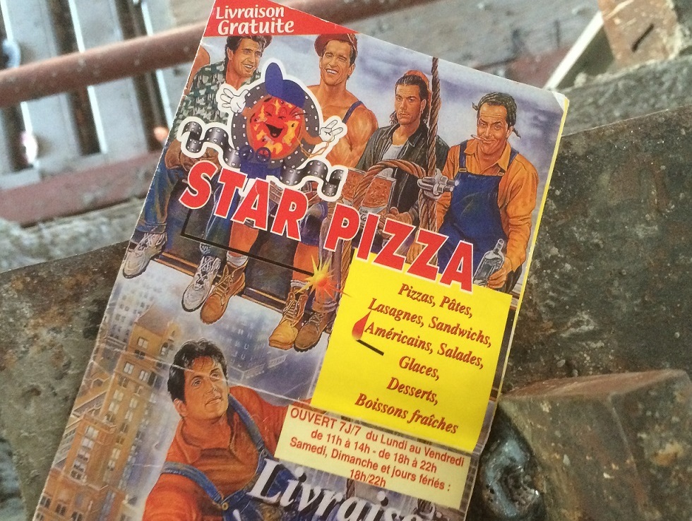The menu is in French so the only words I can make out are some of the combination plates, which include “La Chuck Norris” (tomate, fromage, boeuf hache, poulet, chorizo, olives, origan) and a pizza called “La Stalone” (Creme, lardons, oignons, fromage, olives, origan). The artwork is wacky but impressive. Whoever came up with this concept must have dreamed of it being presented beyond a 1″ x 6″ take-out menu. But then something came to mind…