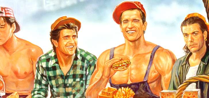 Aside from Van Damme who looks really pissed off, everyone else is in good spirits, eating lunch and probably talking about working out, their favorite 80’s robots, who had the best montages and how many of them slept with Brigitte Nielsen. Schwarzenegger looks the most accurate, evoking the spirit of that big goofy foreign worker who shows up to the jobsite his 1st day wearing massive overalls and nothing underneath. He’s a little dumb but works hard and is happy to be there. Mel Gibson just looks high and Jack Nicholson is wasted beyond belief. Sly Stallone looks to be their fast-food-foreman, swinging around the iron like Tarzan with one hand on a suspension cable and the other on a pizza box.