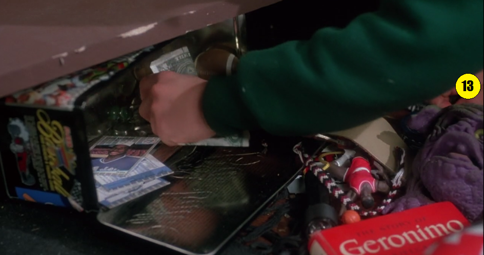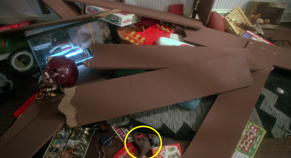 In the above shot, Kevin demolishes his brother’s room by climbing shelves and trying to reach Buzz’s life savings. In a split-second there’s an inflatable shark, which after some extensive research proved to be an actual Jaws: The Revenge promo item, with the movie logo facing opposite our view. That’s all cool and semi-interesting, but nothing compared to what was spotted next…