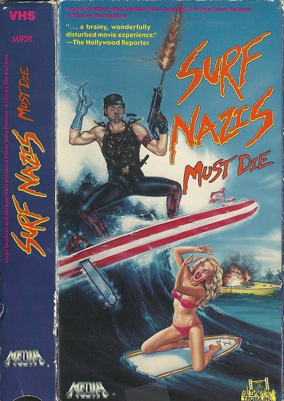 I have just as many fond memories of browsing rows of VHS covers at the mom n’ pop rental places as I do at Blockbuster. When I was in 5th grade I clearly remember reaching into the bargain bin at our Blockbuster and pulling out a copy of Surf Nazis Must Die for $2.99. Normally I’d be too intimidated by horror titles to actually rent one during that time, and browsing around just staring at them was enough excitement. But a Nazi with a robotic hand and machine gun, surfing a wave over a babe looking up in pure terror? Count me in.