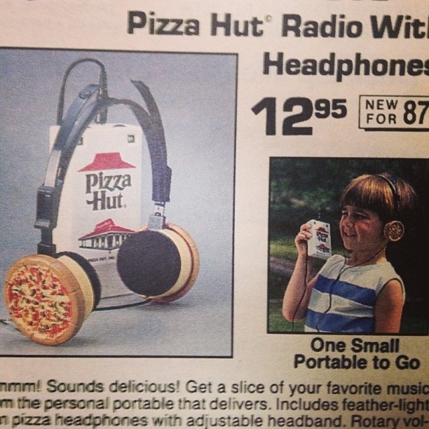 The late eighties saw the partnering of two pop culture giants, Pizza Hut and Radio Shack. In 1986 they released the Radio with Headphones, a true triumph of technology equipped with little pizzas that hugged around your ears! Plus, this was during the age when all headphones had those puffy muffs (don’t know the technical term) to rest on your ‘lobes. Why did those go away? Also why weren’t these pizza headphones more of a big deal? I know whenever TNUC gets a request to DJ pool parties and monster truck gatherings, he’s always wearing these hot numbers while cranking the hits.