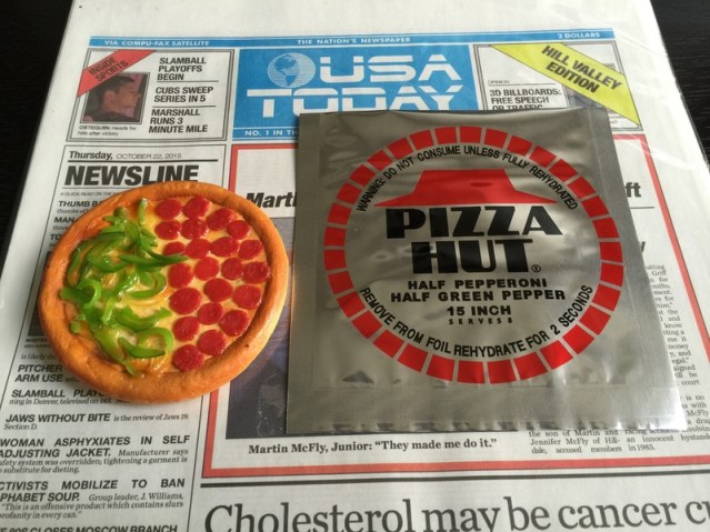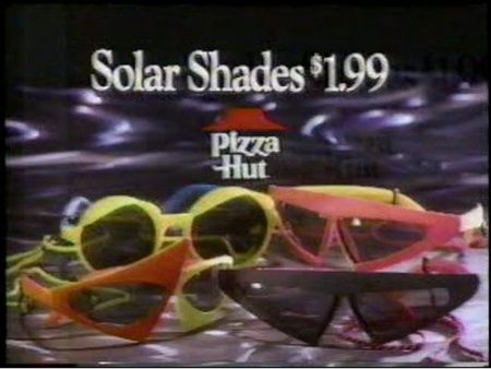 Pizza Hut jumped all over the opportunity for a corporate tie-in with 1989’s Back to the Future Part II. Futuristic commercials aired on TV and kids went wild for Pizza Hut’s $1.99 “Solar Shades” as worn by characters in the movie that hang out at Cafe 80’s. One of the most memorable moments in BTTF 2 was when the McFly family sits down for a hydrated pizza. In the scene, Mrs. McFly takes a dehydrated pizza (about the size of a cookie) and pops it into the Black & Decker hydrator and within a matter of seconds, it comes out piping hot and the size of a conventional pizza!