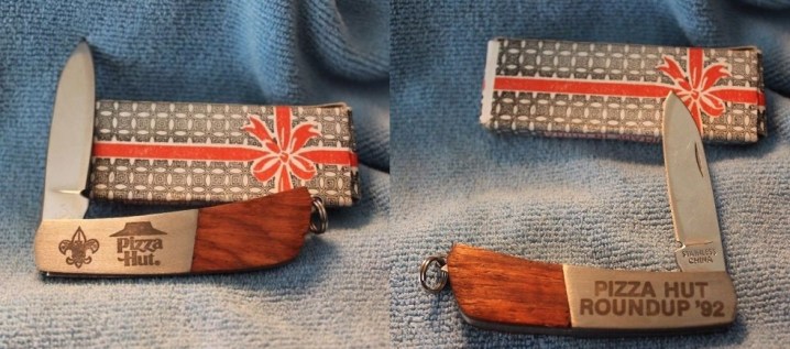If the dirty doily gets the grand prize for the creepiest item on this list, the Pizza Hut KNIFE follows shortly behind. I get a real uneasy feeling looking at this, like it must have been used in a murder or dangerous love affair/scandal. I bet it was a love triangle that resulted in heartbreak and some jealous soul being stabbed by an enraged lustful lover. From its box to even the blue blanket it was photographed on, this had to have showed up in an episode of Unsolved Mysteries.