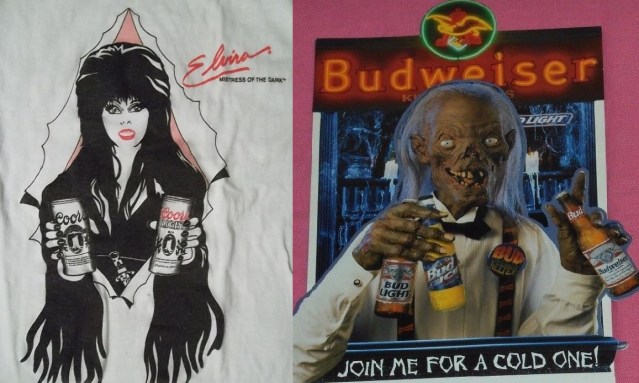 They passed by ceramic skeletons, dried up buckets of blood, multicolored ghouls and airbrushed reapers, then into a circular shaped room. The cart began rotating 360 degrees in view of display rooms containing abandoned horror props, gags and some shockingly impressive scenes. The first was The Cryptkeeper and Elvira competing in a Bud Light VS Coors Light promotional throw down. The once-working animatronics would’ve featured Cryptkeeper dressed in a tuxedo, passing out draft beers and decrepit looking “haunted hot dogs”. Elvira was dressed like Elvira, but her breasts had morphed 3x their original size and she was pushing around a foam cooler stocked with Night Brew™!