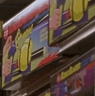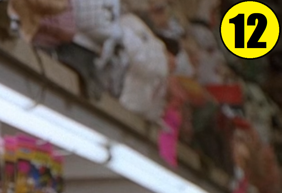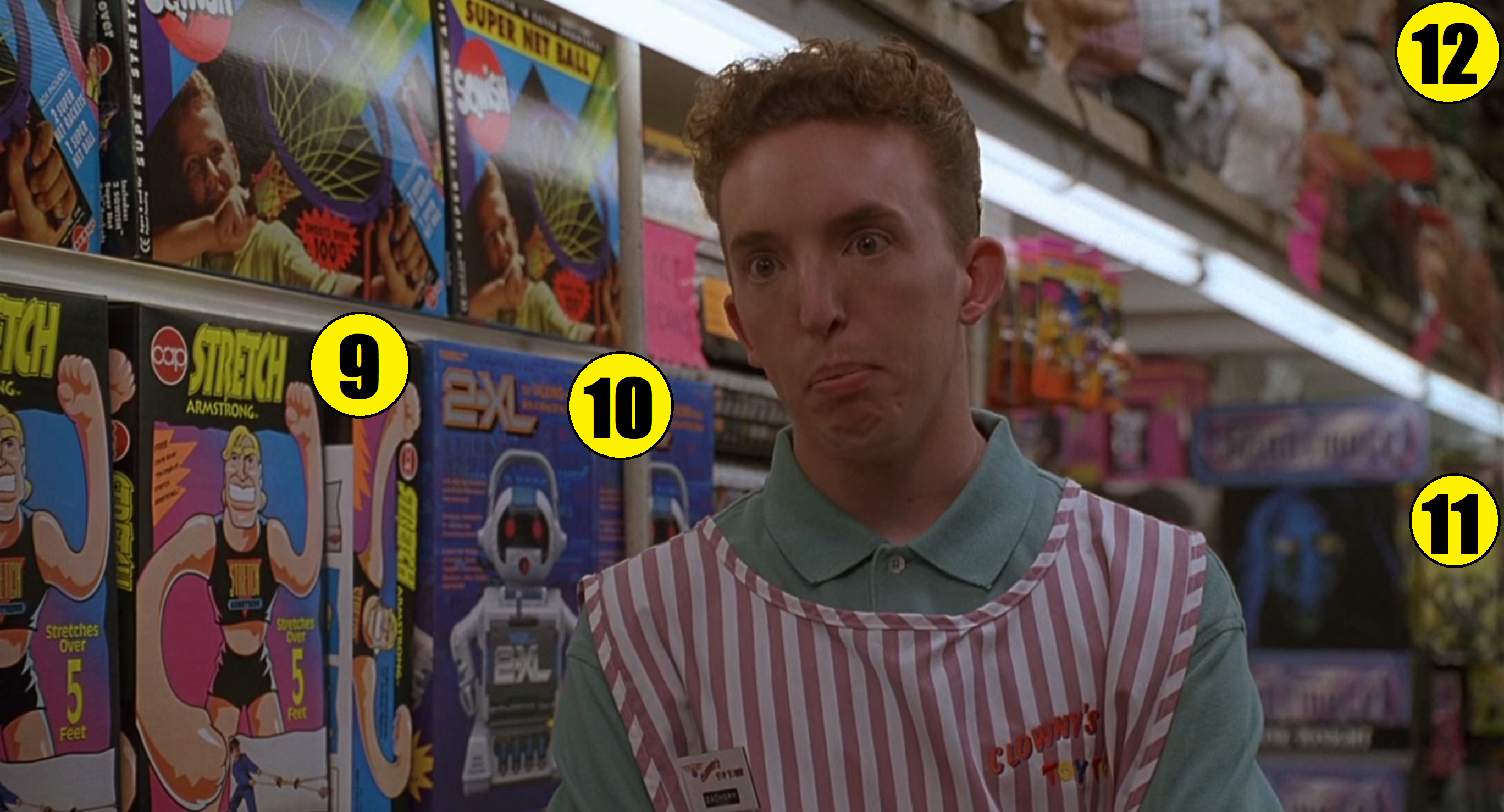 That’s right, I saved the best for last. Until recently pausing this toy store scene, I never saw the plethora of horror masks that line the upper walls of Rex’s toy aisle! This is exciting because we’ve written many times about how the old shops would keep all the bad ass, expensive Halloween masks up in hard to reach areas of the aisles. It actually made the whole vibe that much scarier as you’d look up and see dozens of grotesque masks looking down at you. They’re easy to miss, but if you zoom up it appears that Pinhead, Michael Myers and Dracula were hot sellers of Clowny’s Toy Shop. And really why wouldn’t they be?