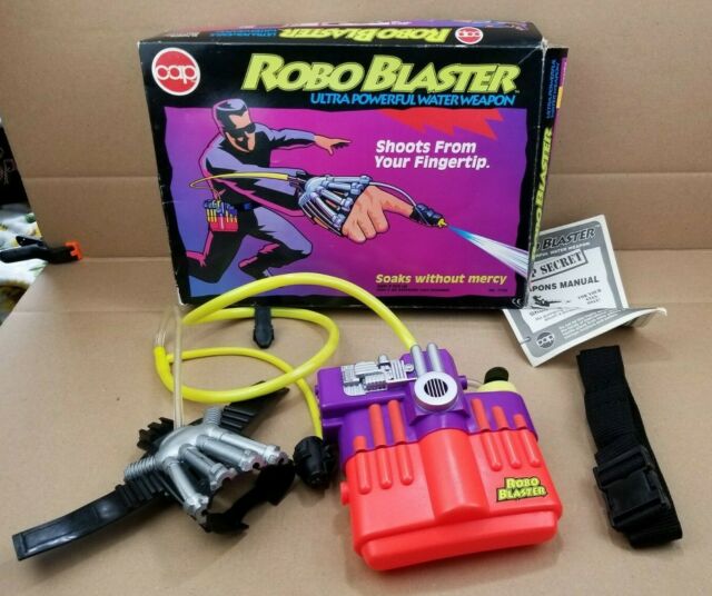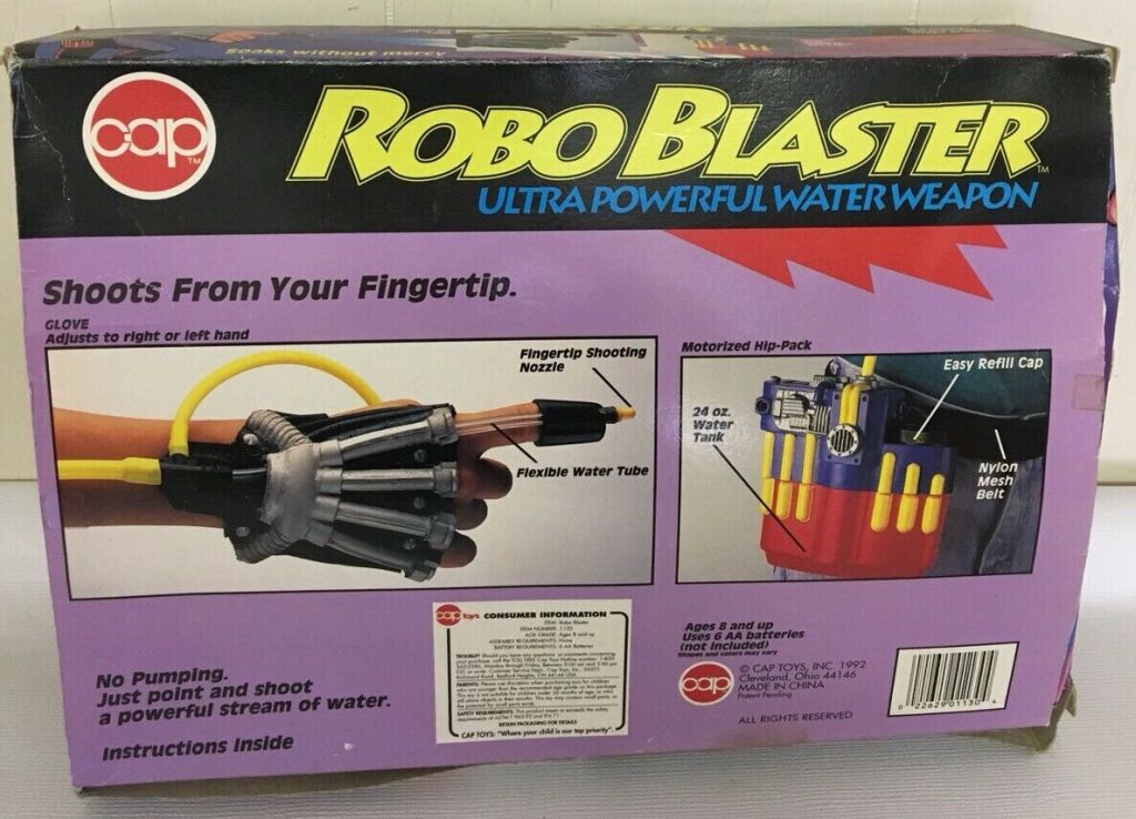 Sometimes I just simply refer to the early nineties as the super soaker era because society was at the absolute brink of squirt gun mania. By 1992, companies began trying different spins on soaker guns and ROBO BLASTER was definitely one example. The unique feature of this water gun was that water shoots from your fingertips and requires NO PUMPING. Every kid knows the anxieties of pumping vigorously as a pack of wild, preteen hyenas are in close range and about to take you down. This toy had clear inspiration from the Terminator/Robocop obsession of those days. “Soaks Without Mercy”