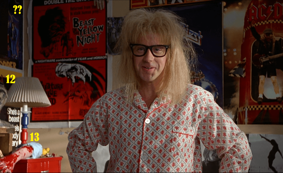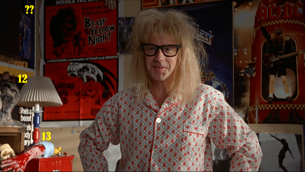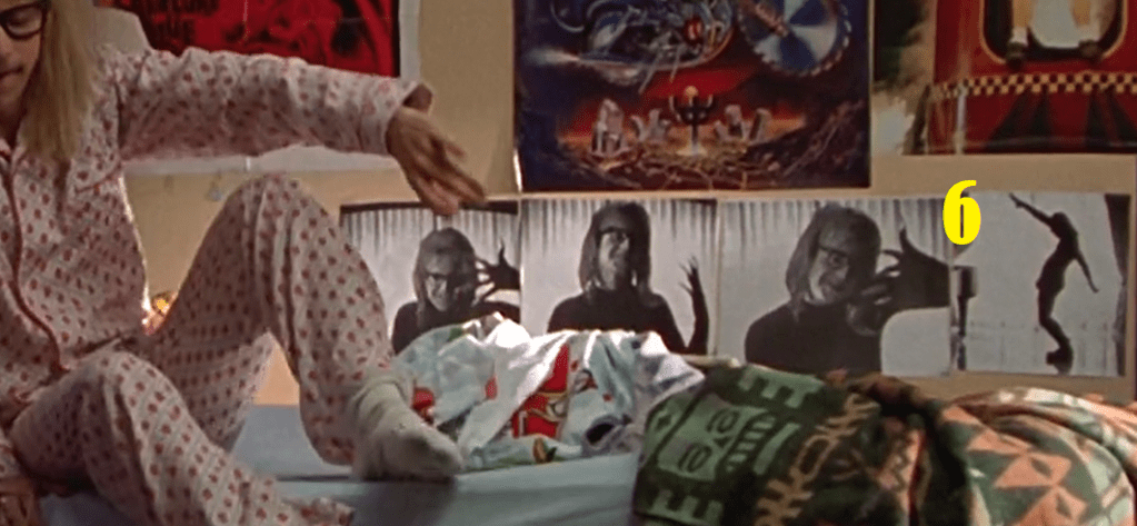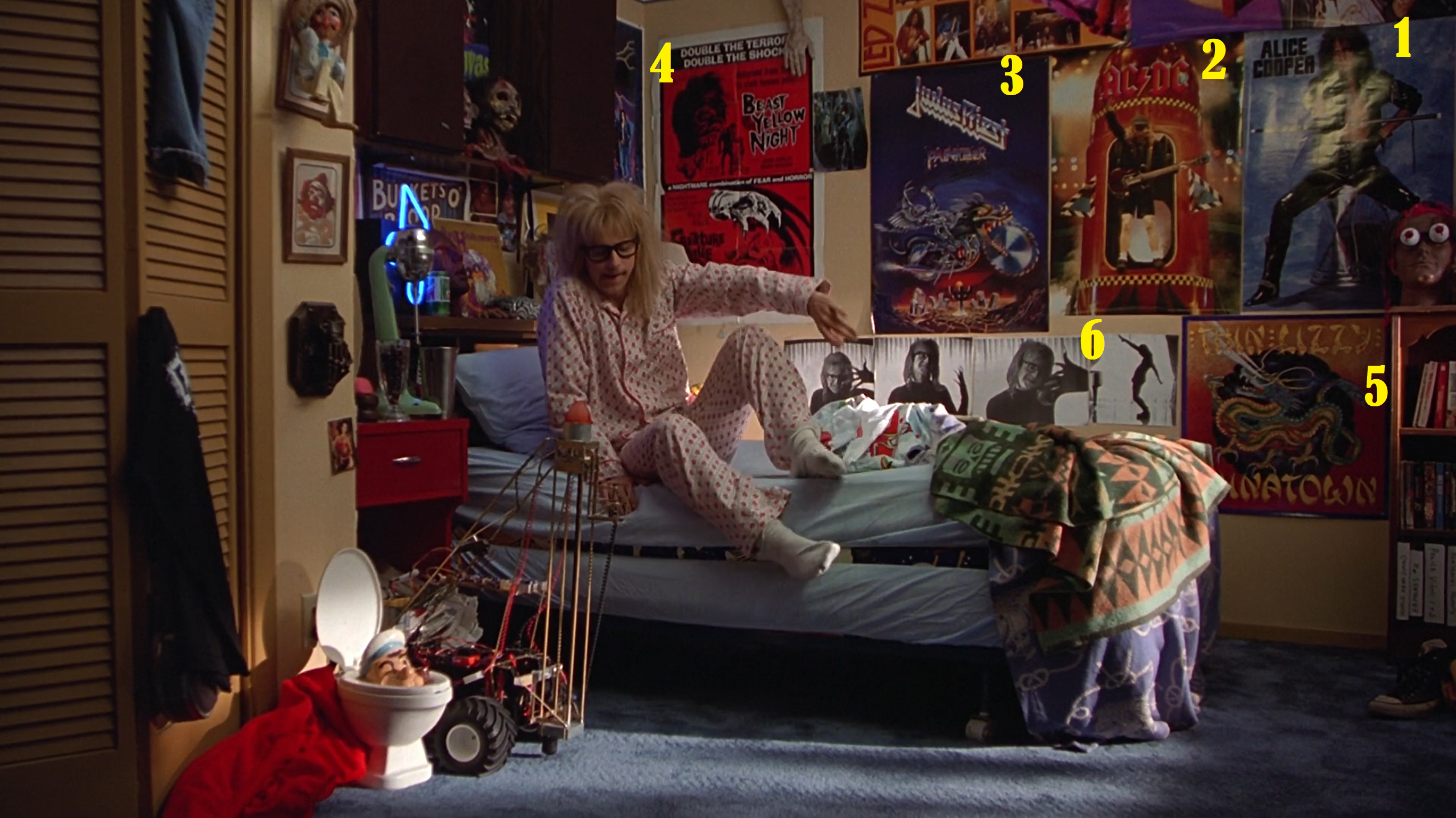 The best teen bedrooms are the ones that capture what’s going on at that exact moment in life. All the current obsessions and “statements” whether that be music, movies, food, extracurricular activities, illegal substances, horses, fast cars or dream girls/hunky men. For Garth, the five second bedroom scene is a quick glimpse inside the brain of a quirky, blonde-mopped teenager who is the best friend of Wayne Campbell. There is so much to cherish about this bedroom. Have a closer look…