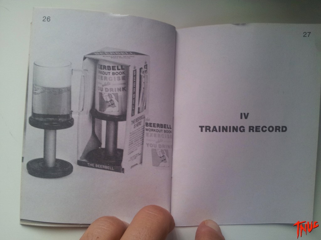 But wait. What would this prized possession be without an instructional book on how to “exercise while you drink”? The booklet features helpful tips and techniques such as the two-handed arm curl, the toast, the lover’s chug, the killer chest fly and even a progress chart to keep track of your workouts.