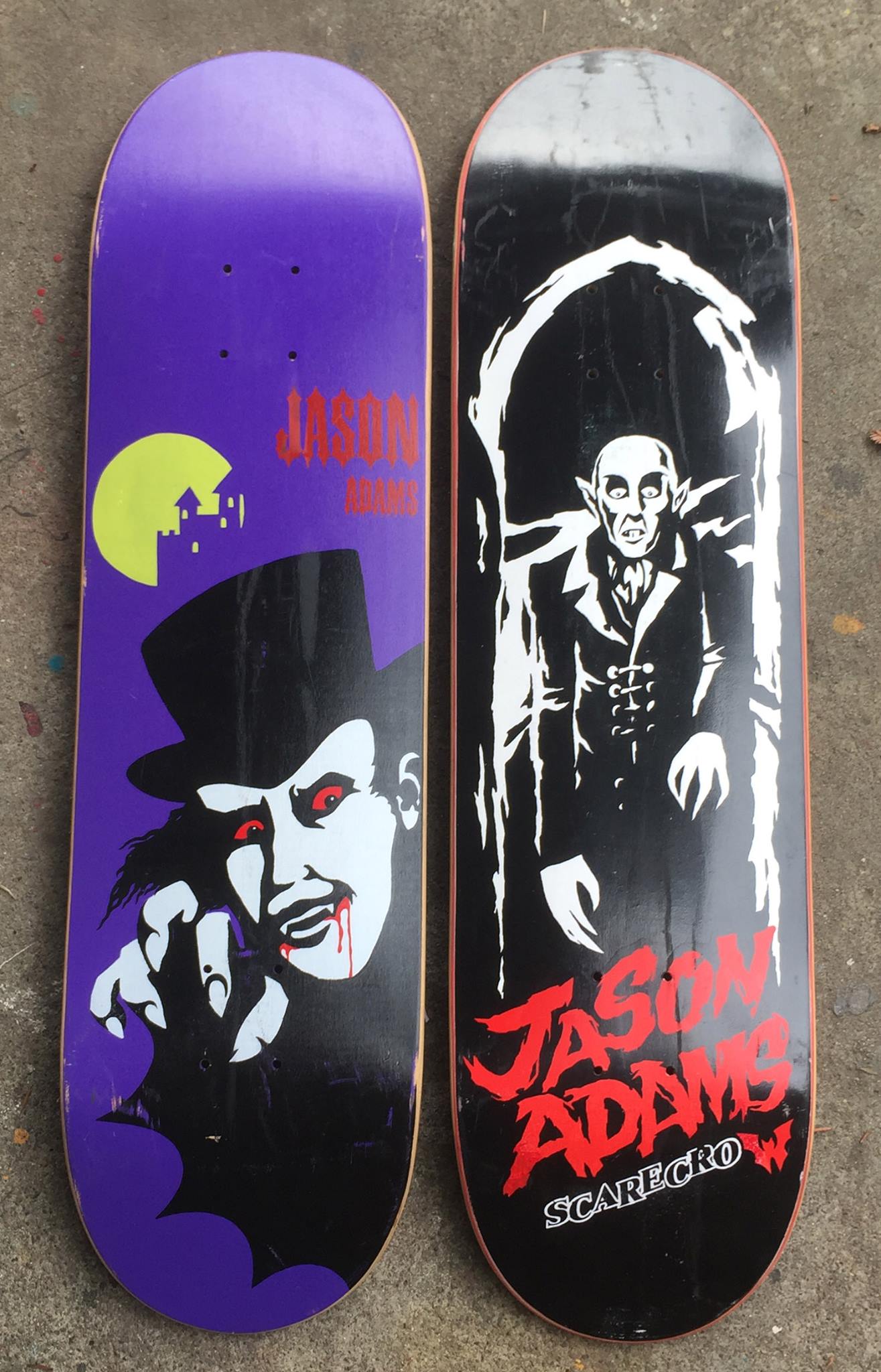 I absolutely LOVED Scarecrow. Everything they created provided me a beginners prelude to spookiness. From the elements of gothic horror to just random shitty photos graveyards in their advertisements. The company really set itself apart from the rest of the pack at the time. From my recollection they were the only ones paying any sort of homage to classic horror. My favorite skater of theirs was Jason Adams who pretty much personified the whole thing about Scarecrow. Twelve year old me loved that his name was a combination of that Jason Voorhees fella and a member of the Addams family (I think?).