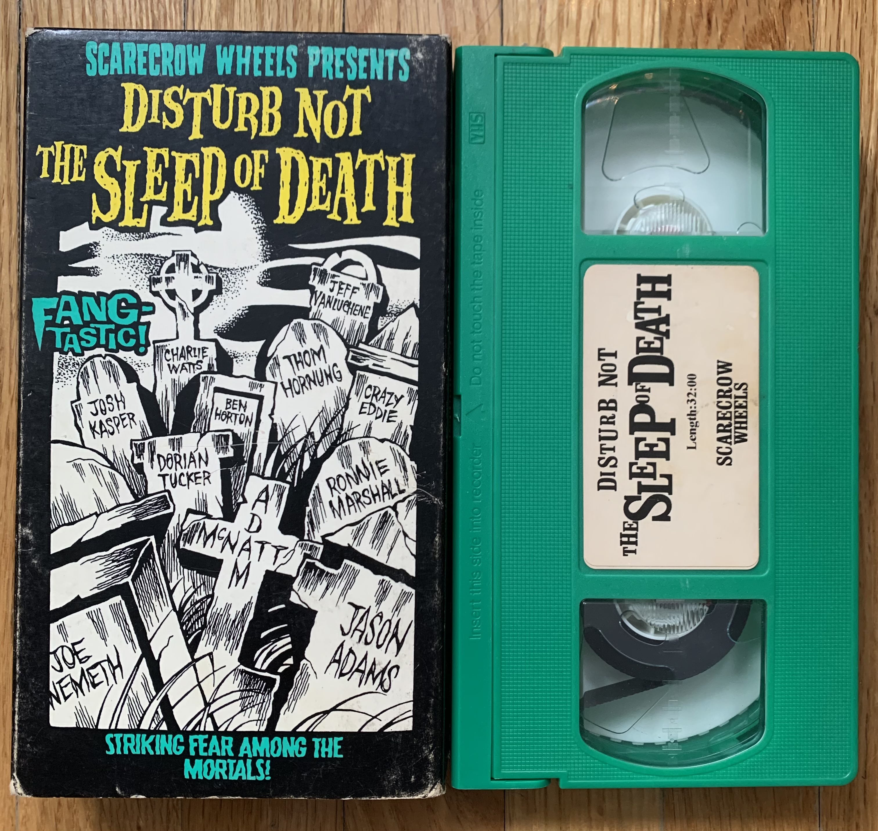 But we’re not here to talk about skateboarding. Speaking in terms of HORROR, the company Scarecrow Skateboard’s ‘Disturb Not the Sleep of Death’ VHS is probably the most impressionable 35 minutes my life during those formidable years. Not only was this video my introduction to ghoulish punk rock (The Misfits, The Damned) but the entire aesthetic of this tape was California skater kids doing their version of a low budget, old school horror movie.